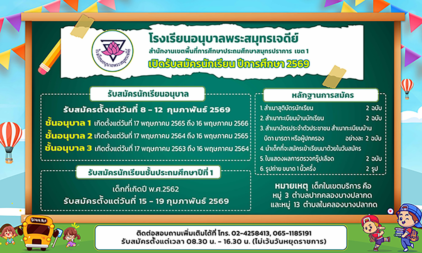 ประกาศรายชื่อนักเรียนที่มารายงานตัวเข้าเรียน ปีการศึกษา 2568 โรงเรียนอนุบาลพระสมุทรเจดีย์ 21 ก.พ. 68
